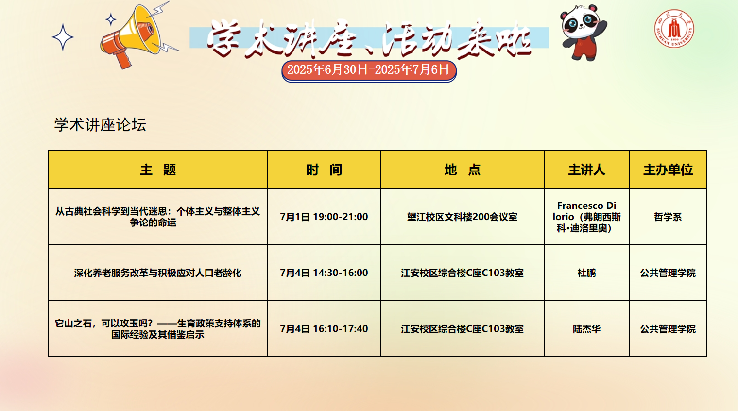 风车动漫 2025年6月30日-7月6日学术讲座论坛及校园文化活动预告