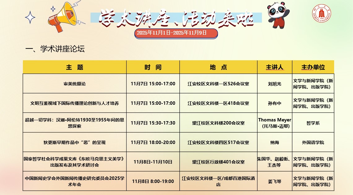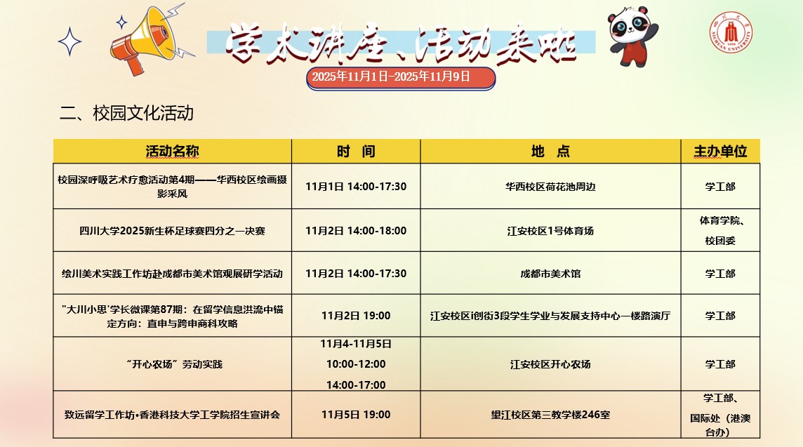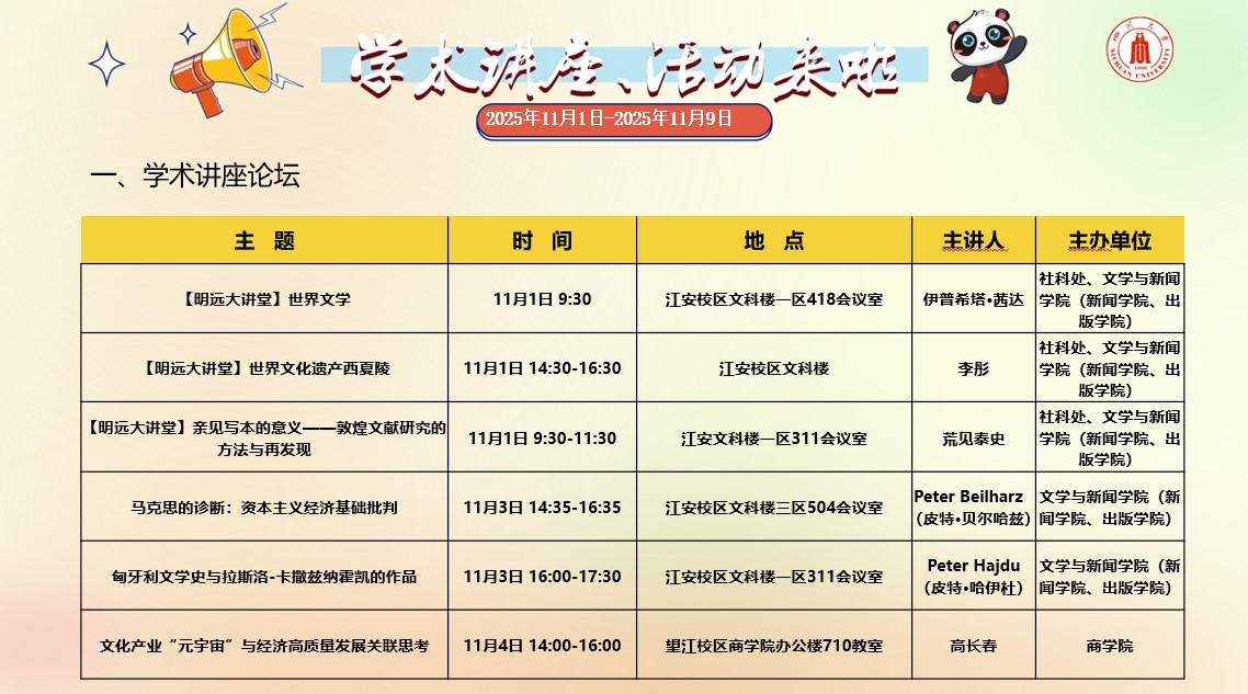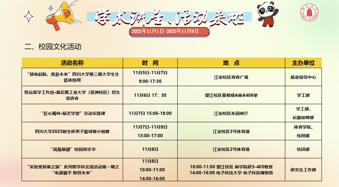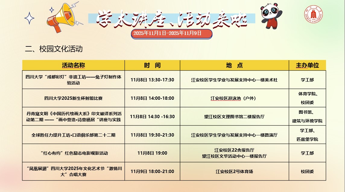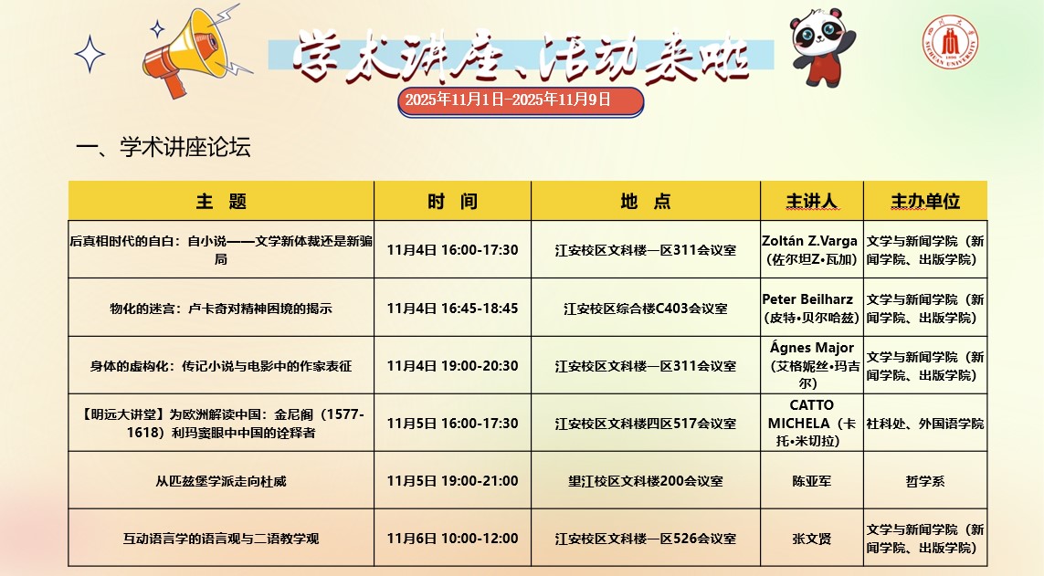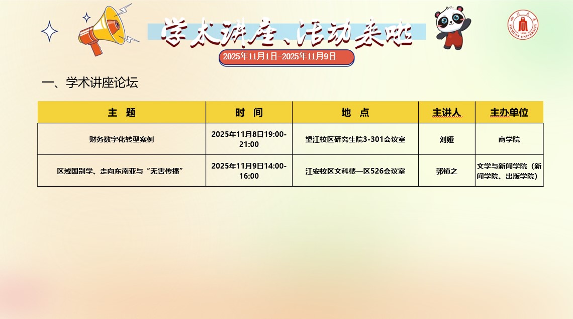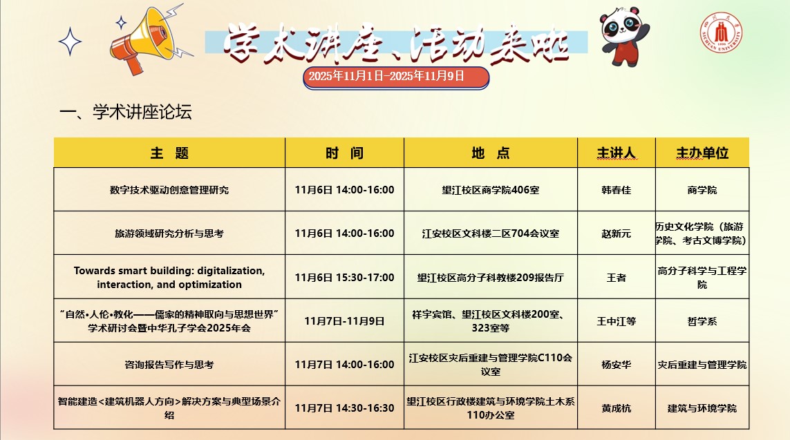 风车动漫 2025年11月1日-11月9日学术讲座和校园文化活动预告