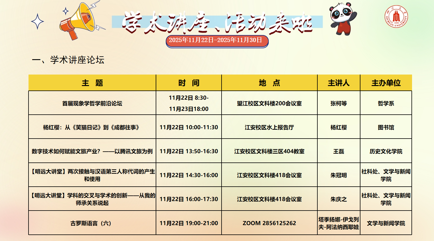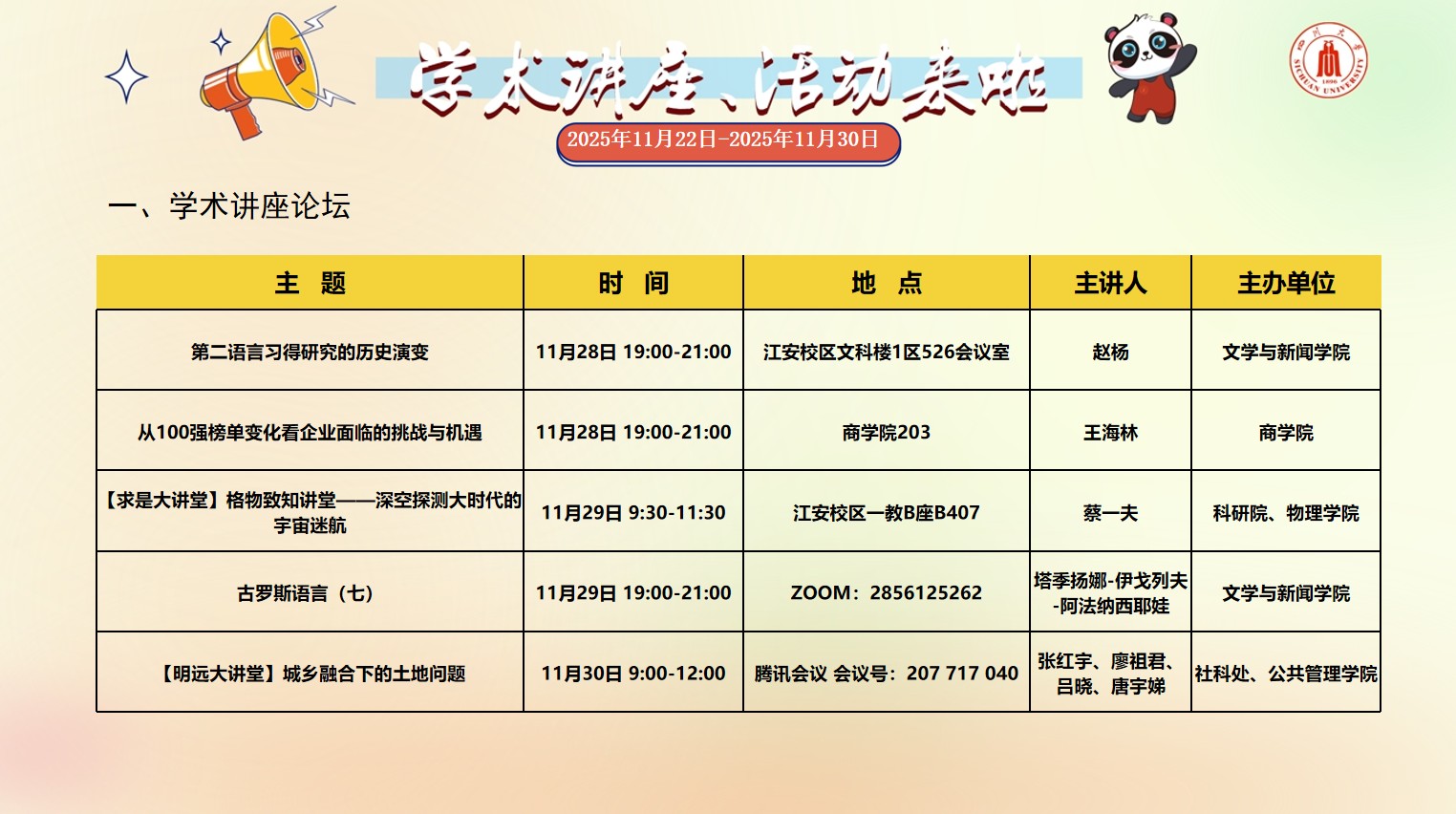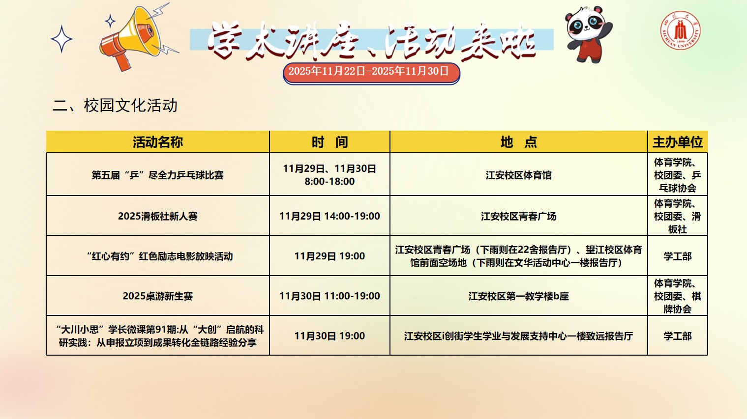 风车动漫 2025年11月22日-2025年11月30日学术讲座和校园文化活动预告