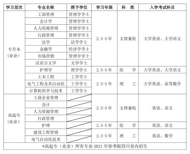 2. 专升本(业余)和高起专(业余)学制2.5年,学习期限2.5-5年。