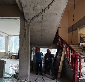 震害考察组以泸定县磨西镇为中心,重点考察了中国科学院贡嘎山站、天主教堂、晓拾客栈、甘孜职业学院、磨西博物馆、大西映画度假酒店、海螺沟中学等多种典型建筑的抗震性能,现场调研各类建筑物震害情况及分析震害原因,并与受损房屋建设单位和受灾群众进行深入交流,为后续协助震后恢复、抗震防灾相关标准或规范修订提供第一手资料。