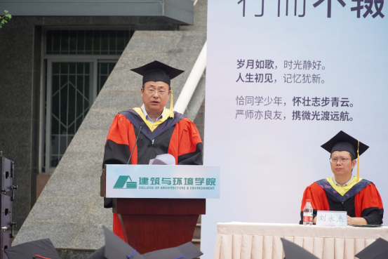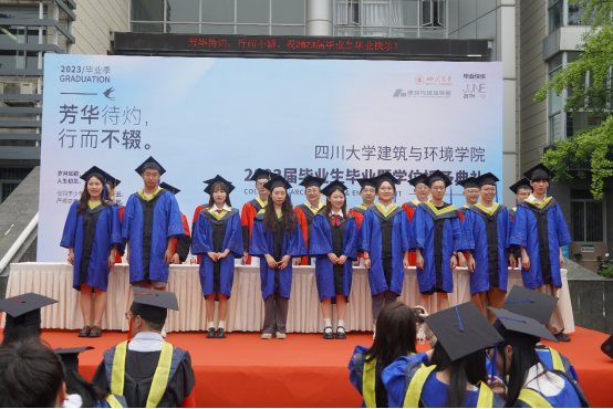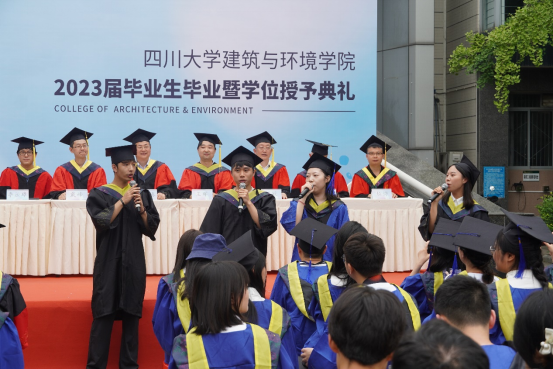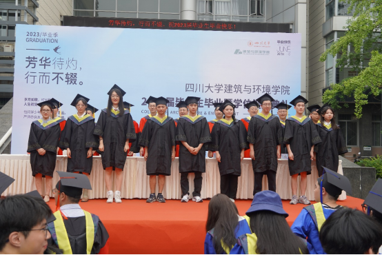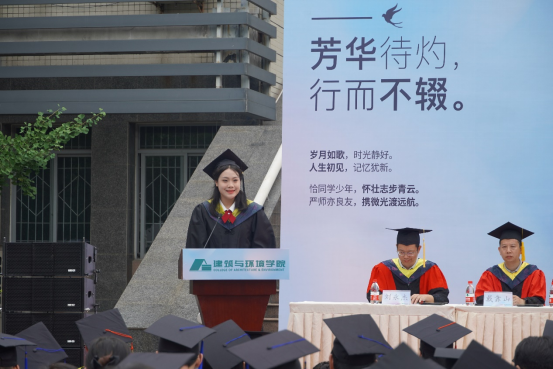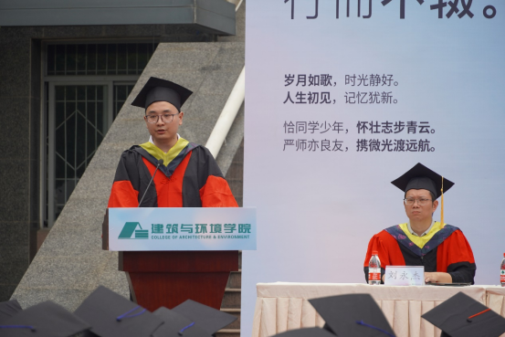 本科毕业生代表土木工程专业任玮楠同学表示身处时代洪流,作为仍能听从内心的召唤,永远是肩上飞扬有风、心似滚烫火焰的有梦青年,将心怀有梦,努力在自己的岗位上展现出川大人、建环人独有的风采。并祝愿学校、学院再展宏图、再谱华章。