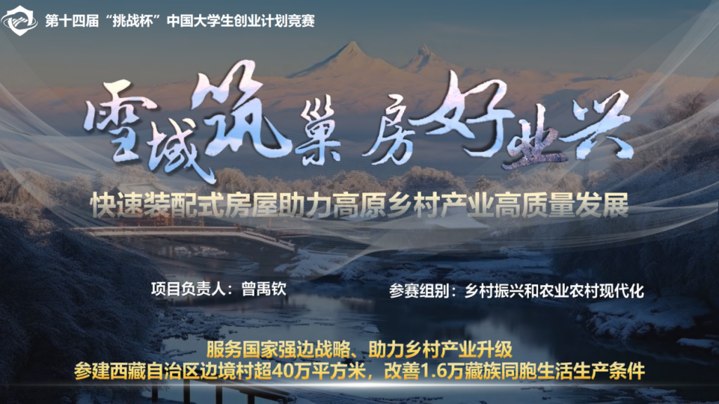 项目简介:团队针对“三高一脆”的青藏高原建房速度慢、保温效果差、使用寿命短三大痛点,开展技术攻关,引入螺栓连接结构体系、发明高效节能保温墙板、提出长寿命墙板生产技术,实现结构快速搭建、建筑节能保温、维护保养简易。团队立足国家“十四五”发展战略中农牧民安置等重大民生工程,服务国家强边战略,以快速装配式房屋助力高原乡村产业升级,回应乡村振兴和农业农村现代化过程中的民生需求。