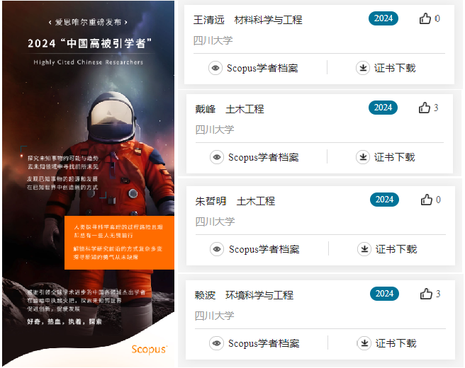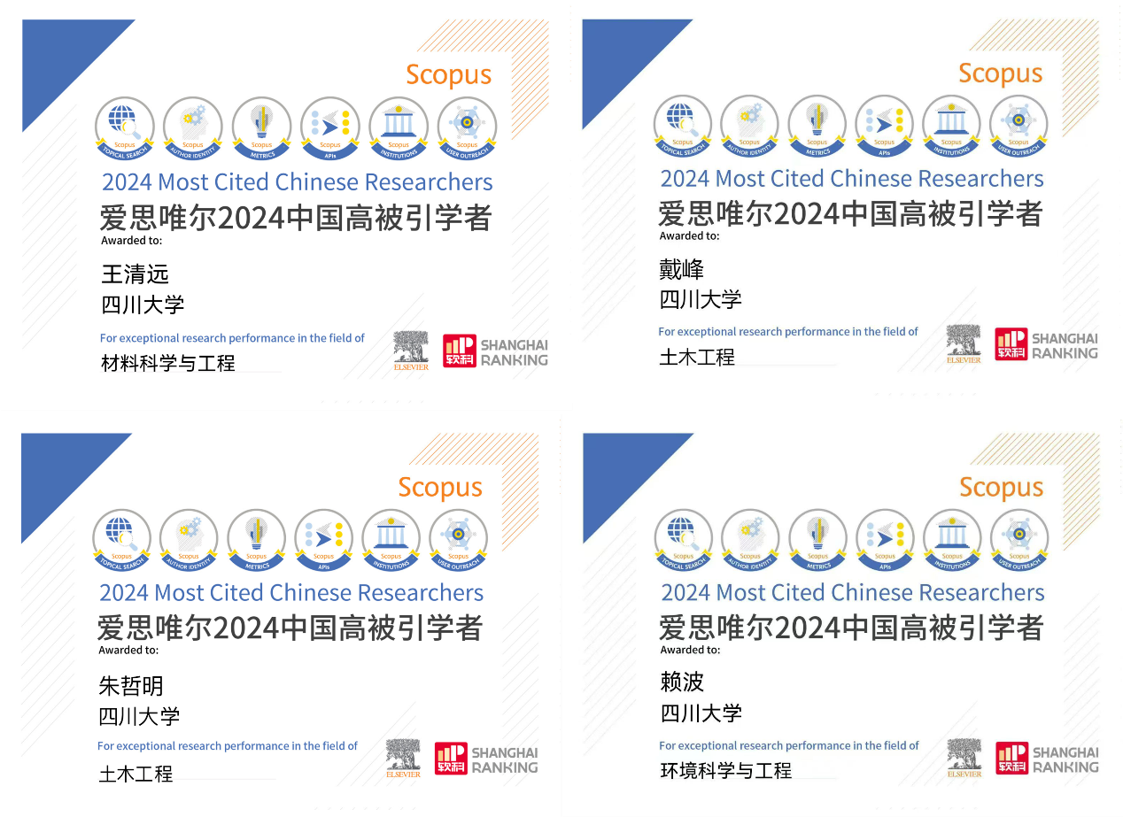 3月25日,爱思唯尔(Elsevier)正式发布2024年“中国高被引学者”榜单,全国共有6388位学者入选,来自547所高校、企业及科研机构,覆盖了10个教育部学科领域中的83门一级学科。学院共有4位学者入围该榜单,分别是王清远教授、戴峰教授、朱哲明教授、赖波教授,入选学科分别为材料科学与工程、土木工程、土木工程、环境科学与工程。