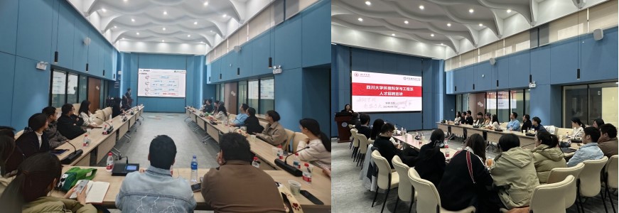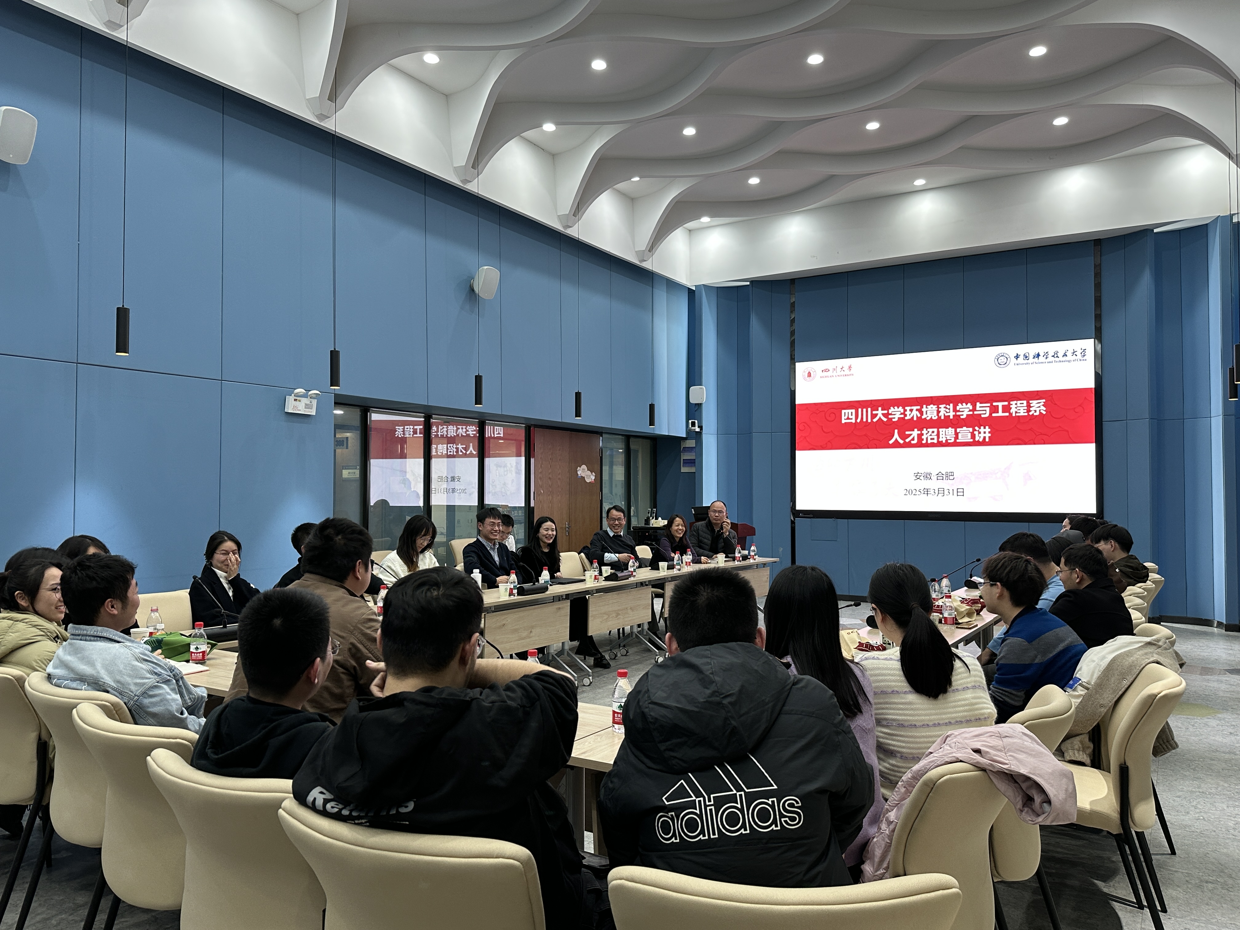 熊兆锟从学科概况、师资队伍、科研平台、职称晋升等角度全面介绍了学院环境系建系以来的发展情况,重点解读“双百人才工程”的申报条件、配套支持、职业发展路径以及川大为引进人才提供的薪酬待遇、科研启动经费及研究生招生指标。何传书以中科大环境系校友身份,结合自身实践,分享了从科研新秀成长为学科骨干的经验。交流环节,与会人员围绕人才引进细则、跨校合作机制及科研资源共享等话题踊跃提问,赖波一行一一做了解答。