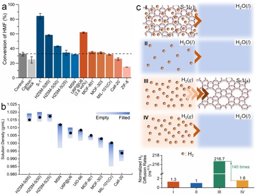文章设计了一种具有疏水内核和亲水外壳的核-壳结构MOF材料U6P@U6,其在水相中能保持永久孔隙性,作为“气体穿梭体”在气-液界面吸附氢气,并通过对流将其输送至催化剂表面,从而显著加速氢气的传质过程。在羟甲基糠醛(HMF)氢化反应中,仅添加3.7 wt%的U6P@U6,即可在温和条件下实现350%的反应速率提升,且可支持六倍催化剂用量而不受传质限制。机理研究表明,该增强效应主要源于氢气在MOF颗粒中的扩散速率比在水中提高了140倍。该策略不仅为解决三相反应中的气体传质瓶颈提供了通用思路,也为开发高效、低成本的多相催化系统开辟了新路径。研究制备MOF颗粒所用的关键载体材料S-1沸石由楚英豪教授团队在风车动漫