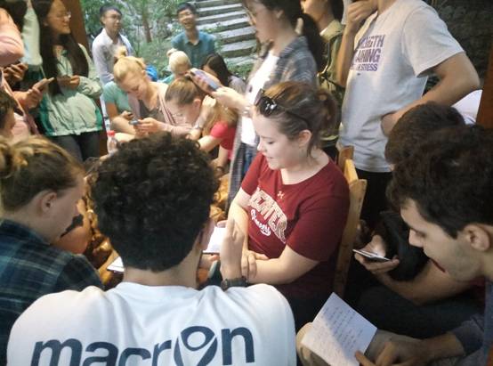 在整个野外考察期间,交流营的中外同学们互助友爱、团结向上,共同面对考察过程中遇到的种种难题,都齐心协力地将其解决,更是体现了川大学子的精神风貌。中国学生与来自澳、意、美、爱尔兰四国的同学一起练习中国歌曲《茉莉花》,一起学习爱尔兰舞蹈,极大促进了中外学生交流,也是考察过程中不可多得的珍贵回忆。
