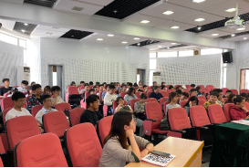 出国留学人员培训部蒲诗璐主讲,辅导员王婷婷主持,百余名有出国出境意愿同学到场参与。