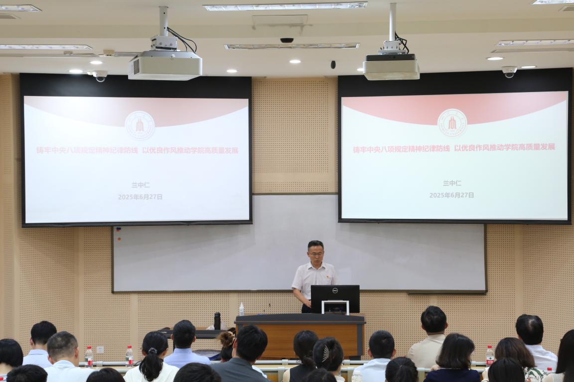 学院党委书记兰中仁在警示教育大会上为全体教师党员上了题为《铸牢中央八项规定精神纪律防线 以优良作风推动学院高质量发展》的专题党课。兰中仁围绕“中央八项规定精神的内容和核心要义”“教育系统违反作风建设典型案例”“以优良作风推动学院高质量发展”三个方面,从深刻认识深入贯彻中央八项规定精神学习教育的背景和意义、切实落实警示教育的必要性与迫切性入手,教育引导党员同志坚持发挥模范带头作用,自觉抵制不正之风、主动接受群众监督,不断强化自身政治理论素养与作风建设,以优良院风、工作作风推动学院高质量发展。专题党课结合真实案例,立足学院发展实际,深入浅出、形象生动,各位老师深受震撼。