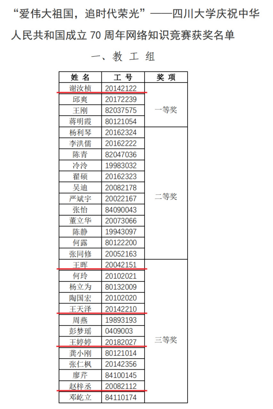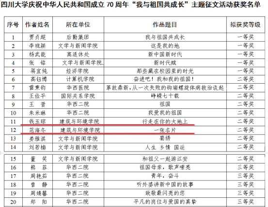 根据学校近期公布的庆祝新中国成立70周年系列竞赛活动结果,学院多位教师在竞赛中取得好成绩。在“爱伟大祖国,追时代荣光”——庆祝中华人民共和国成立70周年网络知识竞赛活动中,学院老师谢汝桢获一等奖,王晖、王天泽、王婷婷、赵梓丞获三等奖。在庆祝中华人民共和国成立70周年“我与祖国共成长”主题征文活动中,学院老师钱玉琼以《行走在你的大地上》、范海冬以《一张名片》分别获二等奖。